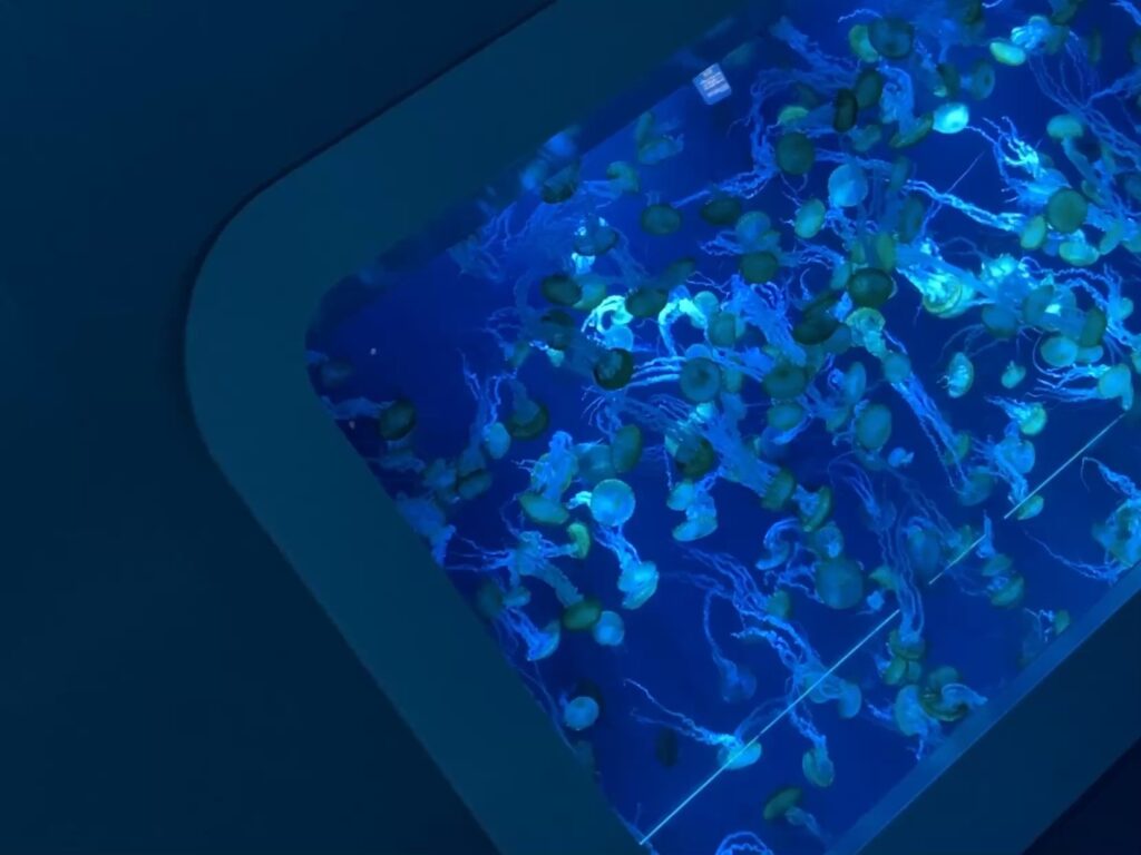 この水槽に人間がたくさん詰められても「うわギチギチやんけ」くらいにしか思わないのにクラゲが入るだけでこんなにも神秘的になるんですね。