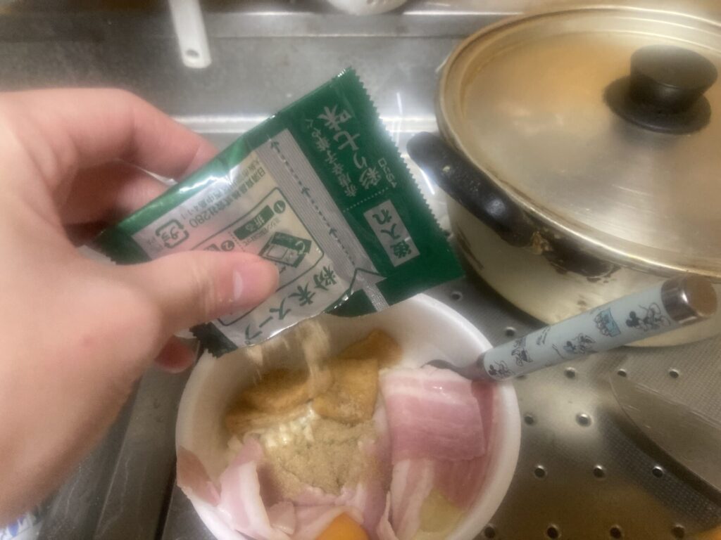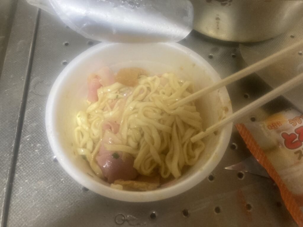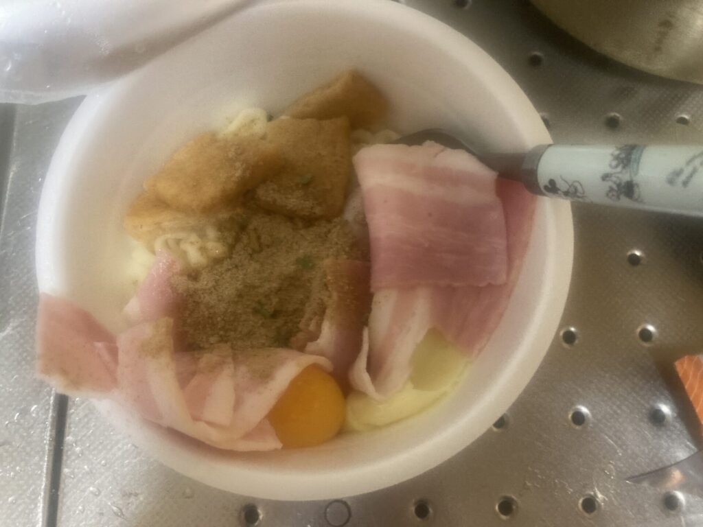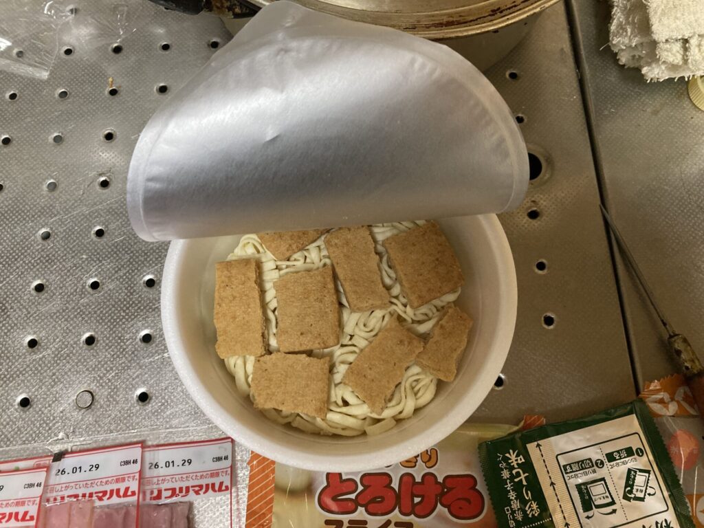 ここで粉末スープを入れずお湯を入れるのですが、おあげを入れるタイミングは好みだそうです。