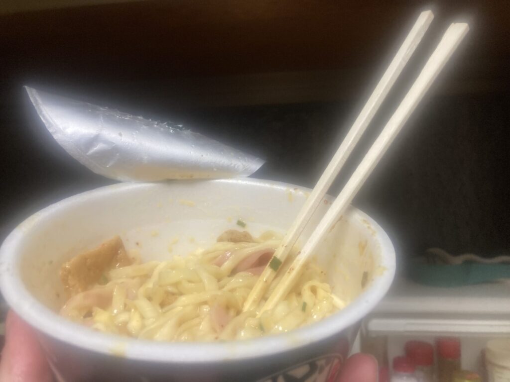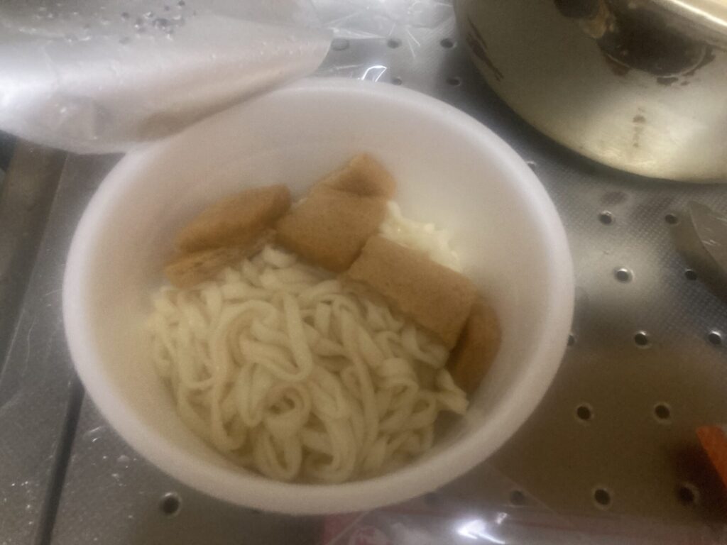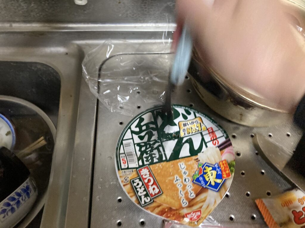 私はうどんにお湯を入れてる5分間、砕かれているおあげを見るのが耐えられなさそうなのでお湯と共に入れます。