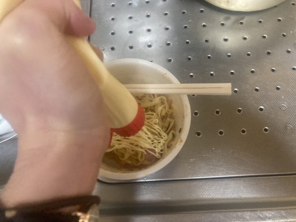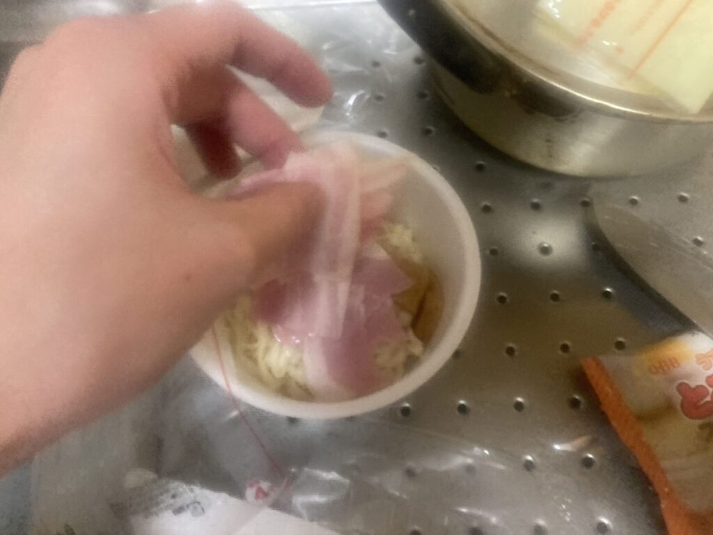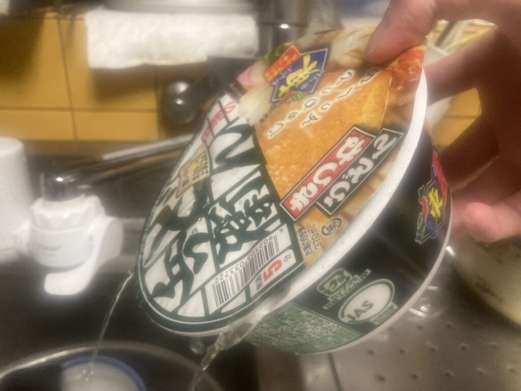 ほいじゃ、どん兵衛に穴を開けてお湯を捨てていきますよ。