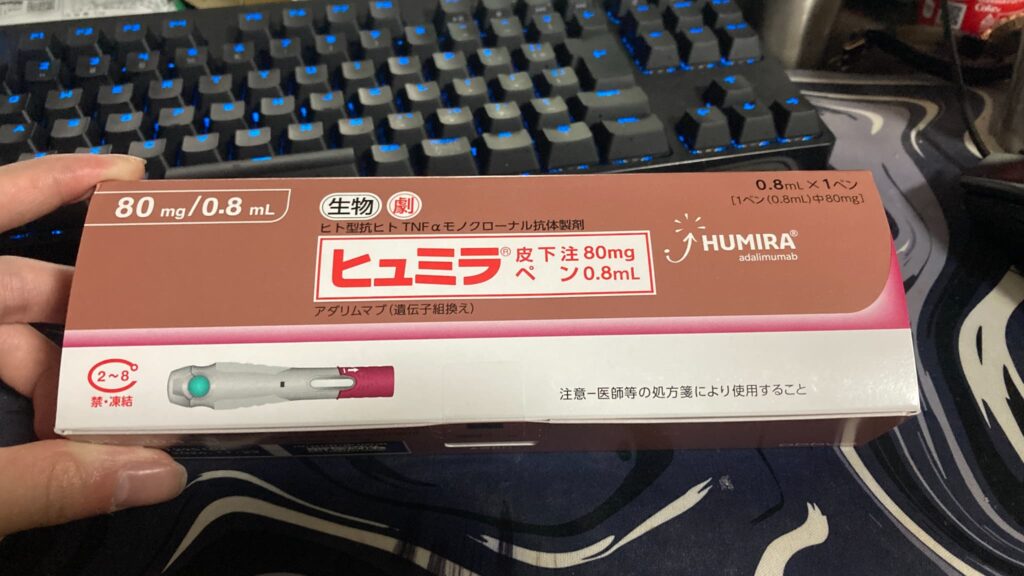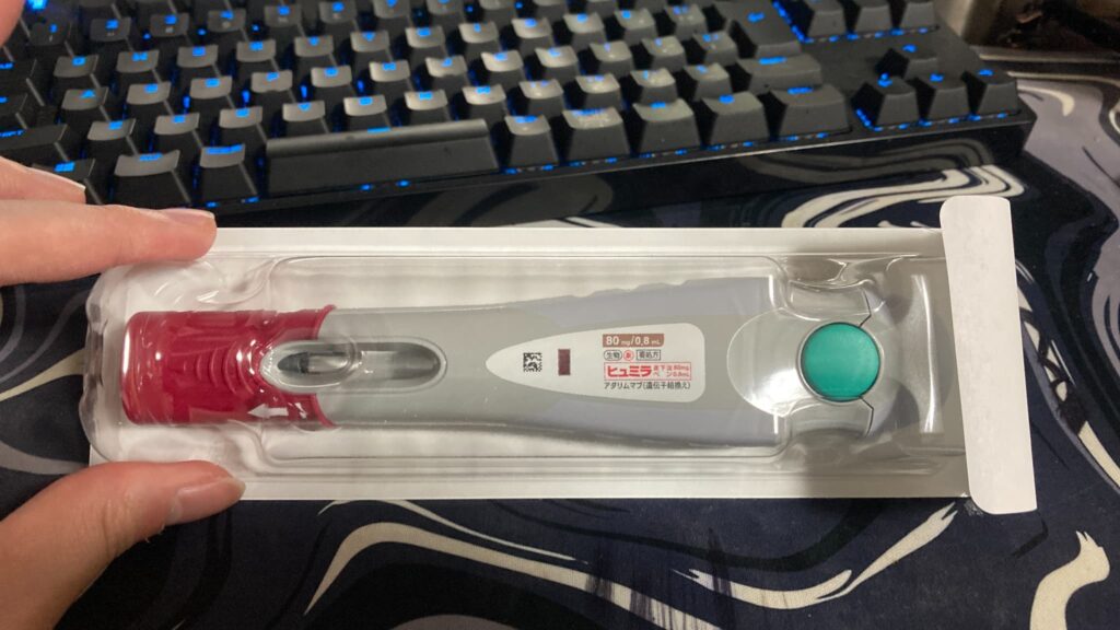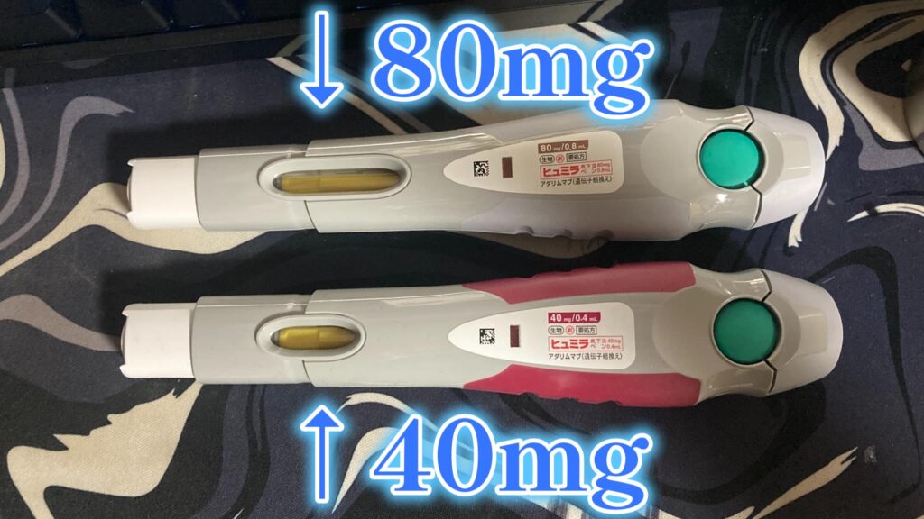 画像では80mgペン0.8mLと記載されていますが、ついこの間までは40mgペン0.4mLを2本使用していました。