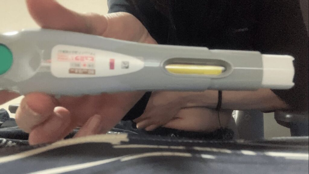 本体に緑のボタンがありますが、これを押すと隠れた注射針が出るって寸法ですね。